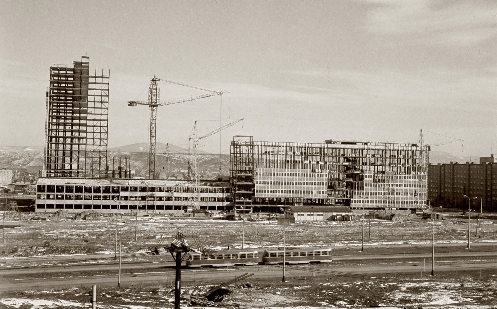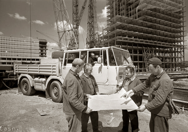 13. august 1971 – projektový kolektív nad plánom pôvodne 23-podlažného lôžkového monobloku. Zľava Michal Kelemeca, Michal Kocan, Ladislav Fedorják, dispečer Hutných montáží a Michal Kačúr.