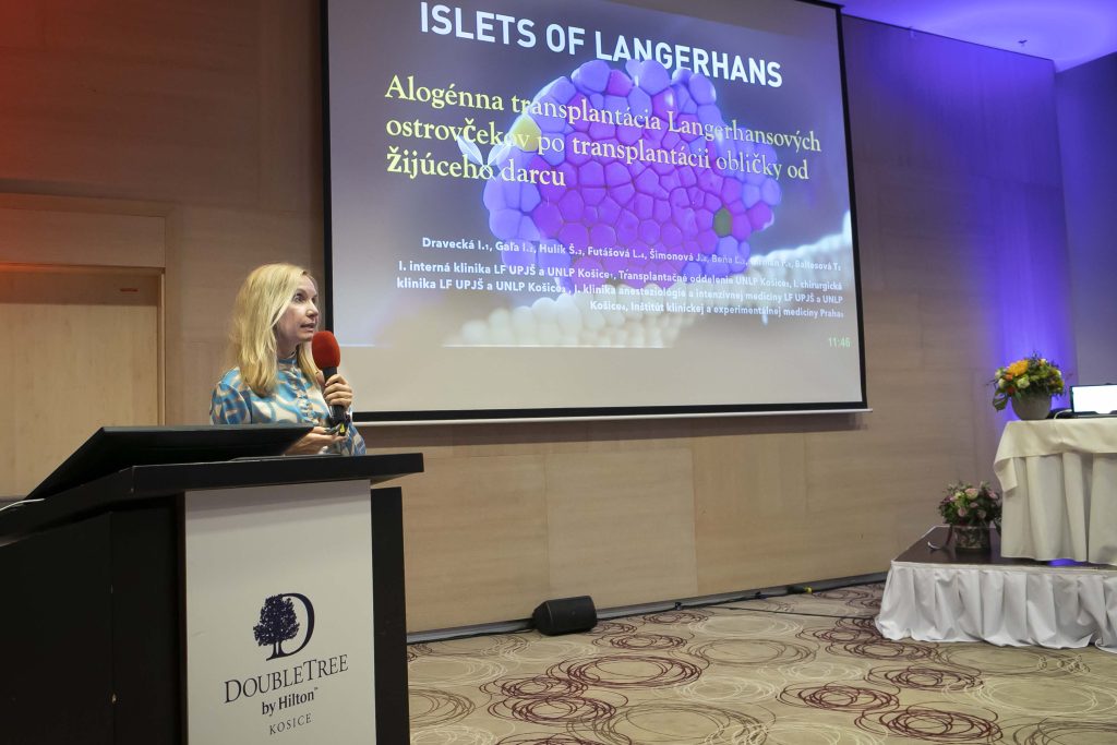 UNLP Košice dostala v úvode kongresu priestor na prezentáciu prvej alogénnej transplantácie pankreatických ostrovčekov na Slovensku od mŕtveho darcu. Úspešná transplantácia buniek pankreasu pre pacientku s cukrovkou 1. typu je výsledkom spolupráce mnohých odborov a špecializácií v rámci našej nemocnice, a tiež mimoriadnej spolupráce s českým Inštitútom klinickej a experimentálnej medicíny (IKEM). Inovatívnosť spočívala aj v tom, že sme u pacientky s diabetom a zlyhaním obličiek uskutočnili začiatkom septembra dve transplantácie po sebe v priebehu niekoľkých dní. Najskôr transplantáciu obličky a následne transplantáciu endokrinných buniek pankreasu, ktoré produkujú inzulín. „U 38-ročnej pacientky sa výrazne zlepšila metabolická kompenzácia diabetu, zaznamenali sme menší výskyt hypoglykémií, glykémie sú v norme až 90% zo dňa, pacientka má tiež voľnejšiu diétu, čo sa celkovo odrazilo na lepšej kvalite života pacientky,“ uviedla v prezentácii doc. MUDr. Ingrid Dravecká, PhD.