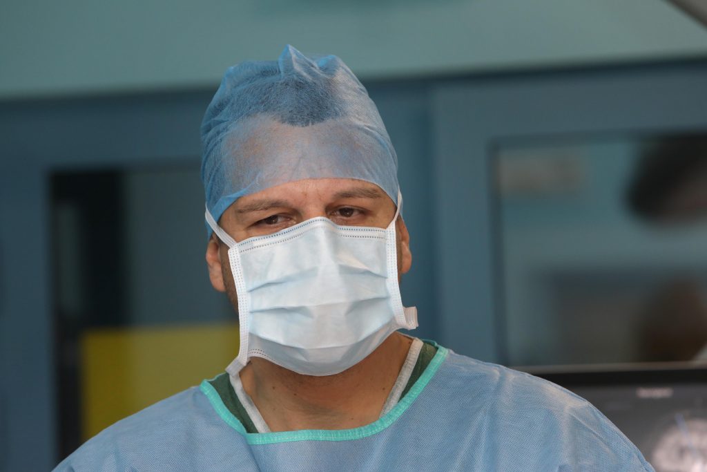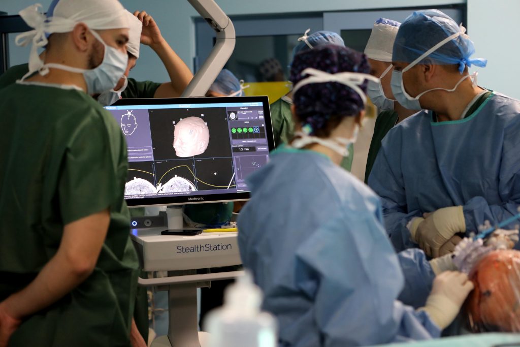 Samotná implantácia elektród prebieha v lokálnej anestézii, „čiže pacient je po celú dobu pri vedomí, aby sme mohli priebežne kontrolovať jeho motorické a kognitívne schopnosti. Musí napríklad vymenovať všetky mesiace v roku alebo hýbať rukou podľa pokynov. Po zavedení elektród nasleduje implantácia neurostimulátora pod kľúčnu kosť, ktorá už prebieha v celkovej anestézii,“ uzatvára prednosta kliniky docent Kaťuch, ktorý spolu s kolegami realizoval prvé tzv. bezrámové implantácie systému hlbokej mozgovej stimulácie na Slovensku.