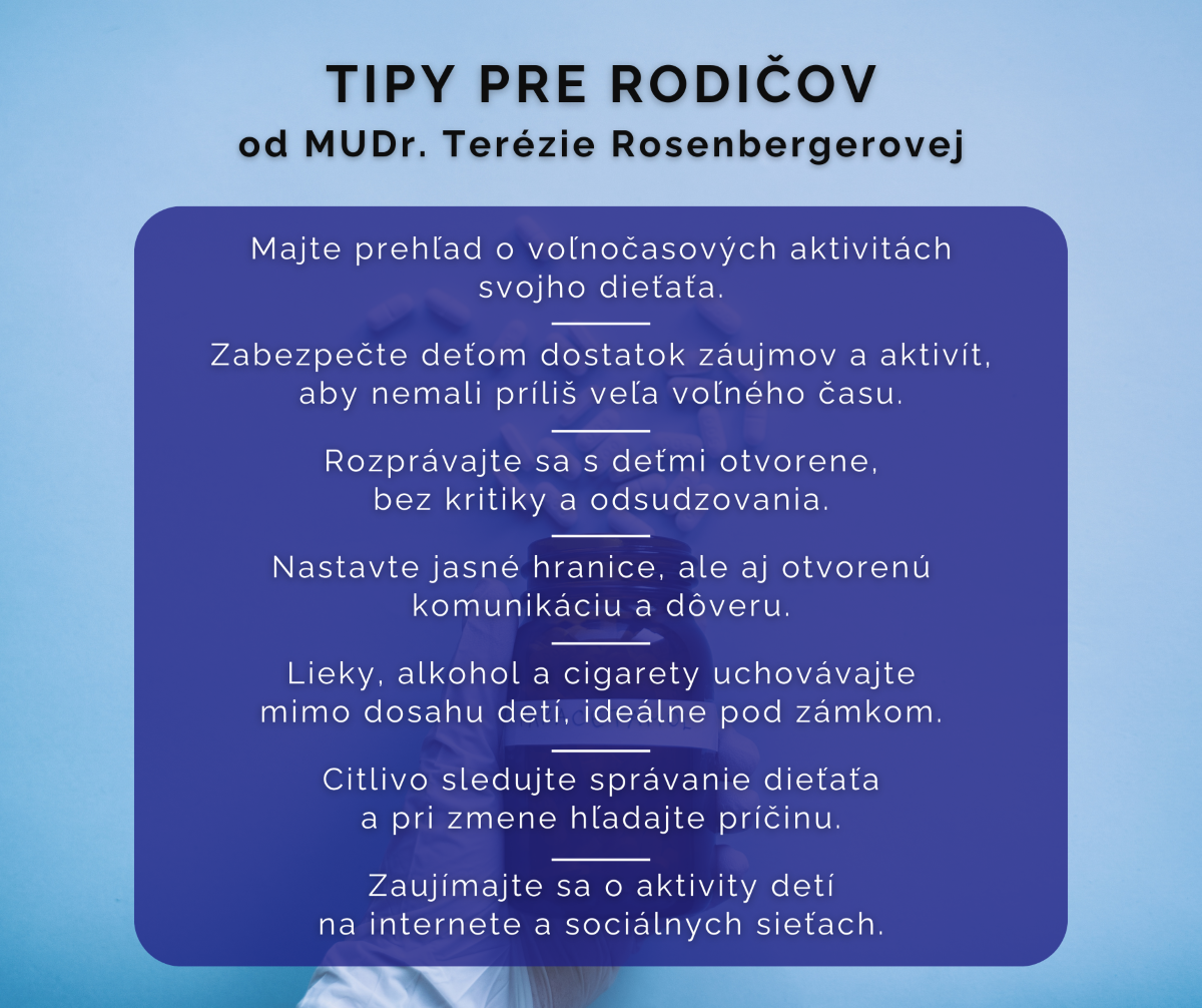 V prvom rade treba venovať deťom čas, pozornosť a veľa sa s nimi rozprávať. Dôležité je, aby mali rodičia prehľad o tom, aké lieky majú doma, kde sú pohodené cigarety, koľko majú alkoholu a peňazí, ktoré by mohli deti použiť na kúpu liekov.