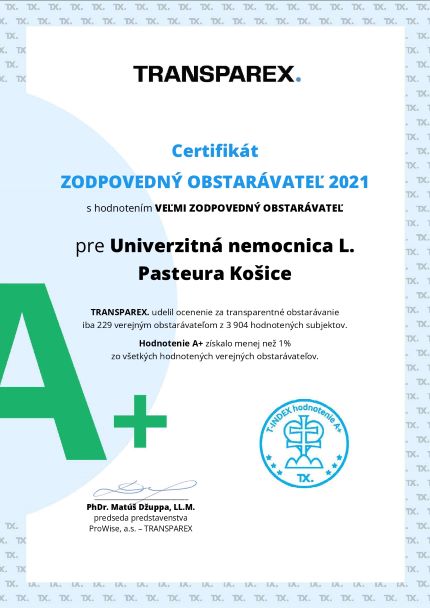 Univerzitná nemocnica L. Pasteura Košice získala ocenenie A+ VEĽMI ZODPOVEDNÝ OBSTARÁVATEĽ. „Ocitli sme sa medzi  najlepšími verejnými obstarávateľmi spomedzi takmer štyritisíc verejných inštitúcií. Spomedzi 73 hodnotených nemocníc a zdravotníckych zariadení sme skončili na 13. mieste. Zaväzuje nás to pokračovať v nastavenom trende a budem rád, ak sa nám v budúcnosti podarí ešte zlepšiť našu pozíciu,“ hovorí riaditeľ UNLP Košice MUDr. Ľuboslav Beňa, PhD., MPH.
