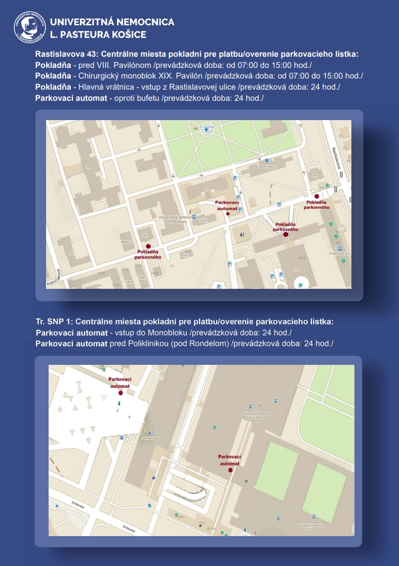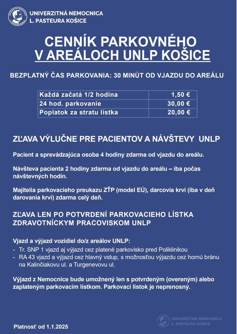 Zľava z parkovného platí výlučne pre pacientov, ktorým bola poskytnutá zdravotná starostlivosť na medicínskych pracoviskách UNLP Košice a pre ich návštevy: