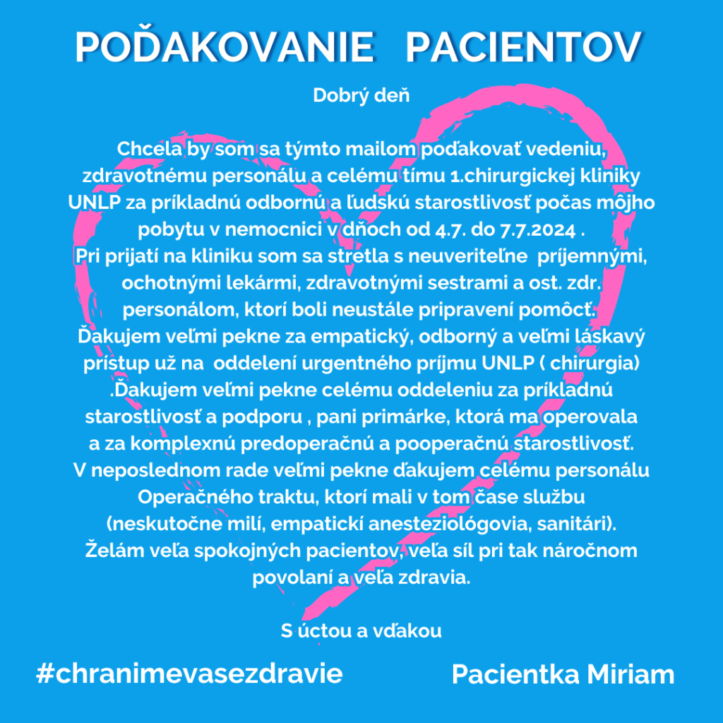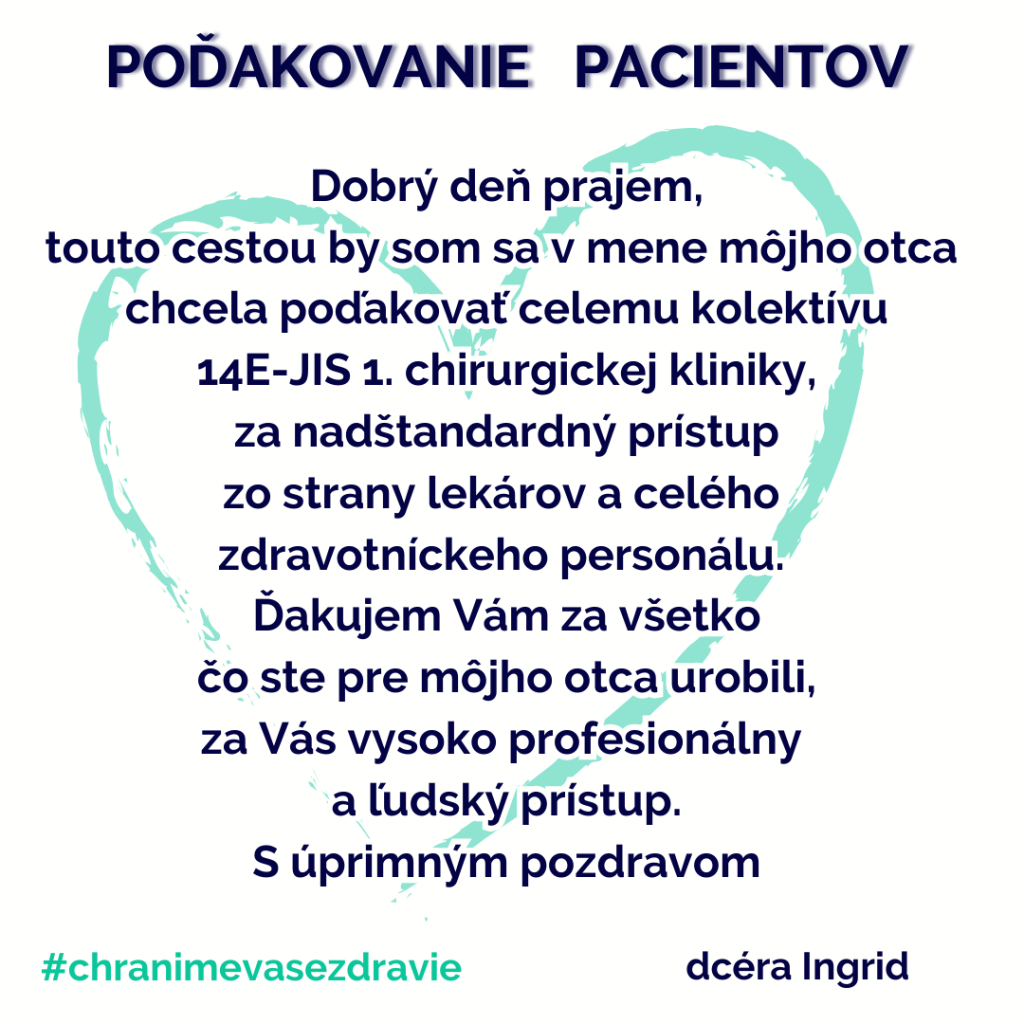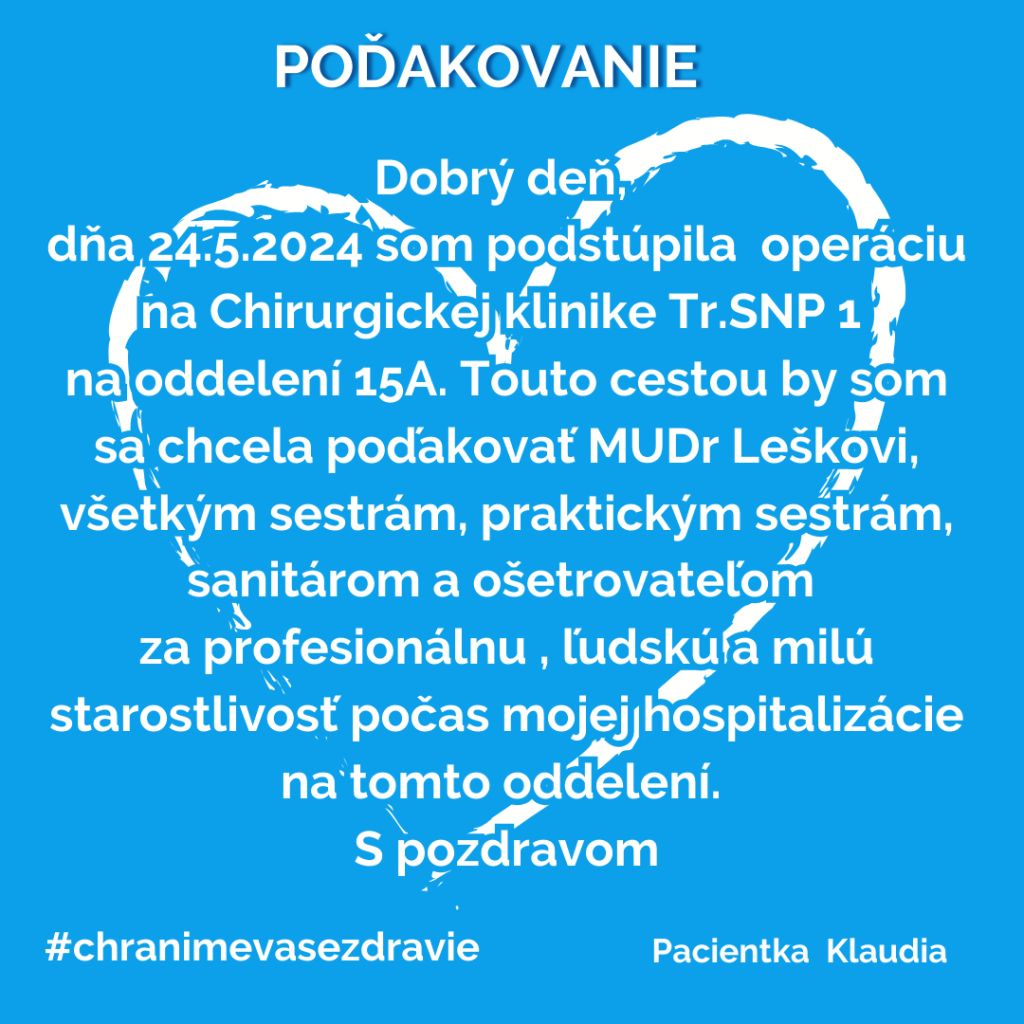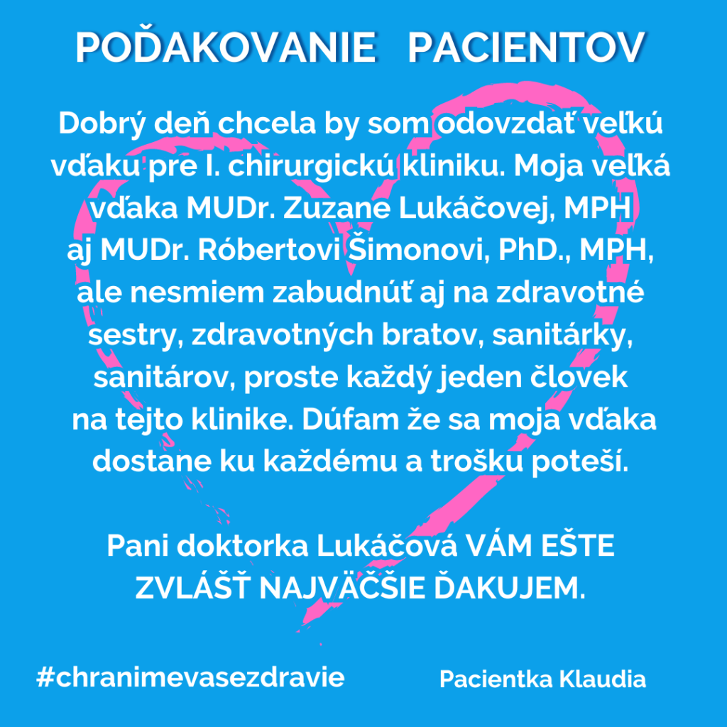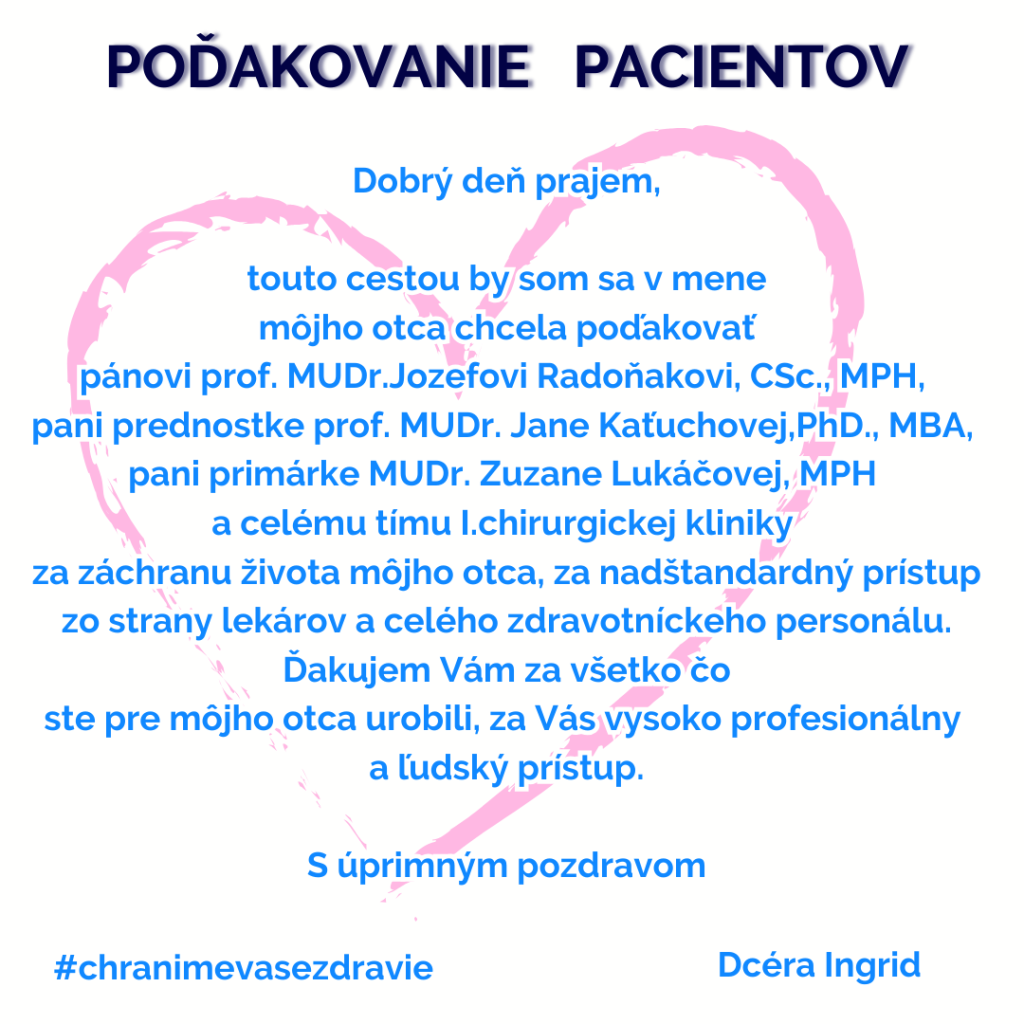 POĎAKOVANIE pre I. chirurgickú kliniku, Tr. SNP 1.