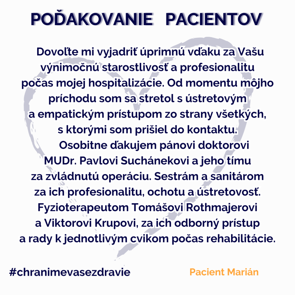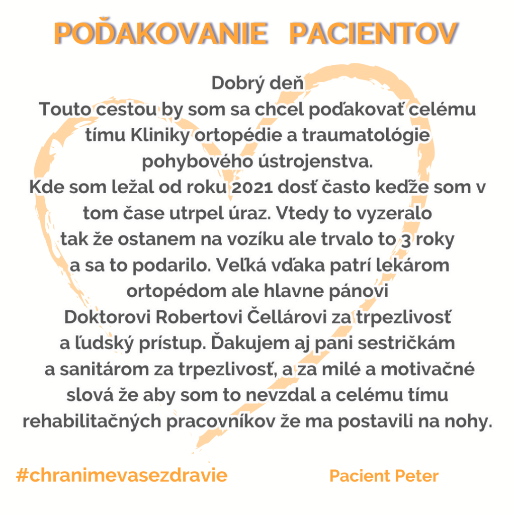 POĎAKOVANIE pre Kliniku ortopédie a traumatológie pohybového ústrojenstva, Tr. SNP 1.