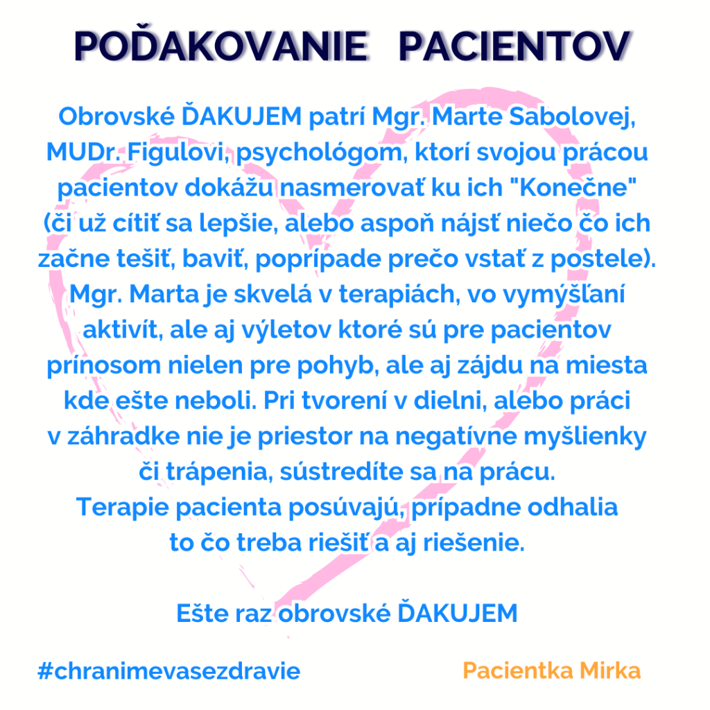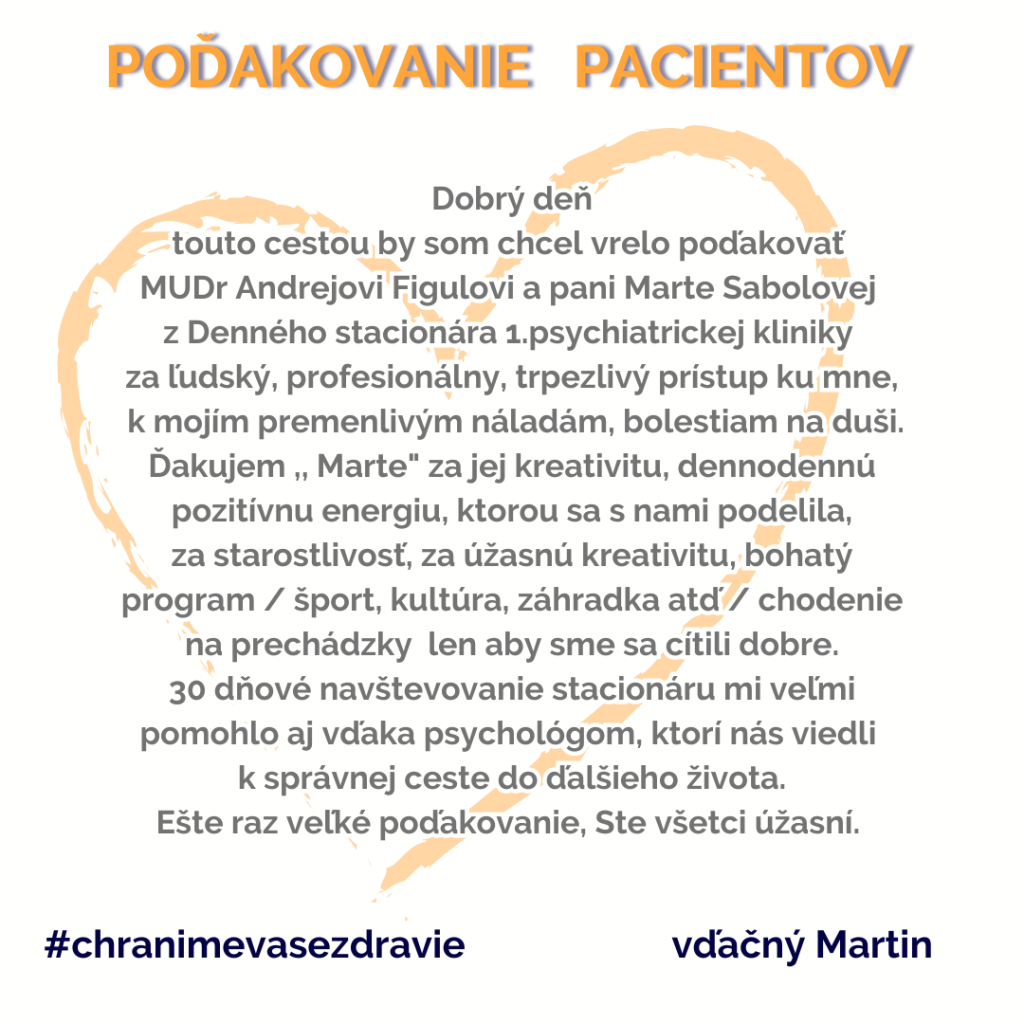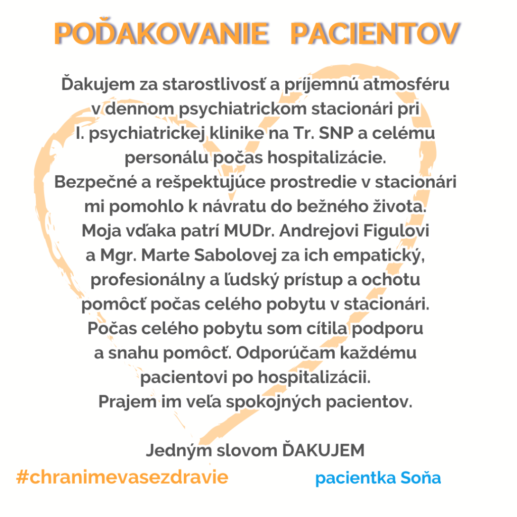 POĎAKOVANIE pre Denný psychiatrický stacionár, I. psychiatrická klinika, Tr. SNP1