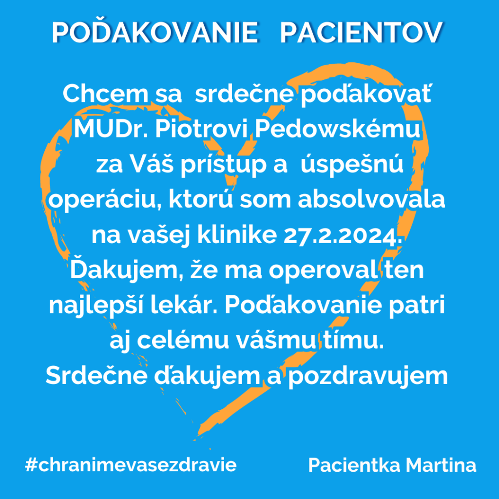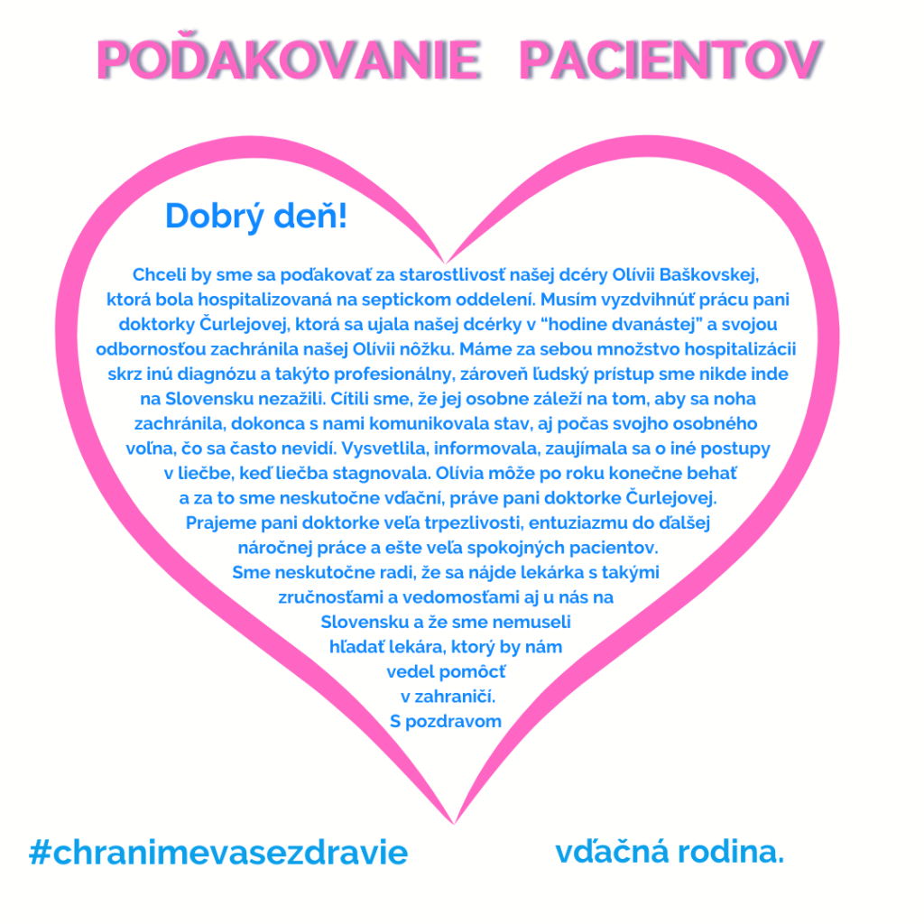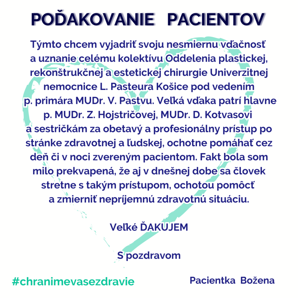 POĎAKOVANIE pre Oddelenie plastickej, rekonštrukčnej a estetickej chirurgie, Rastislavova 43