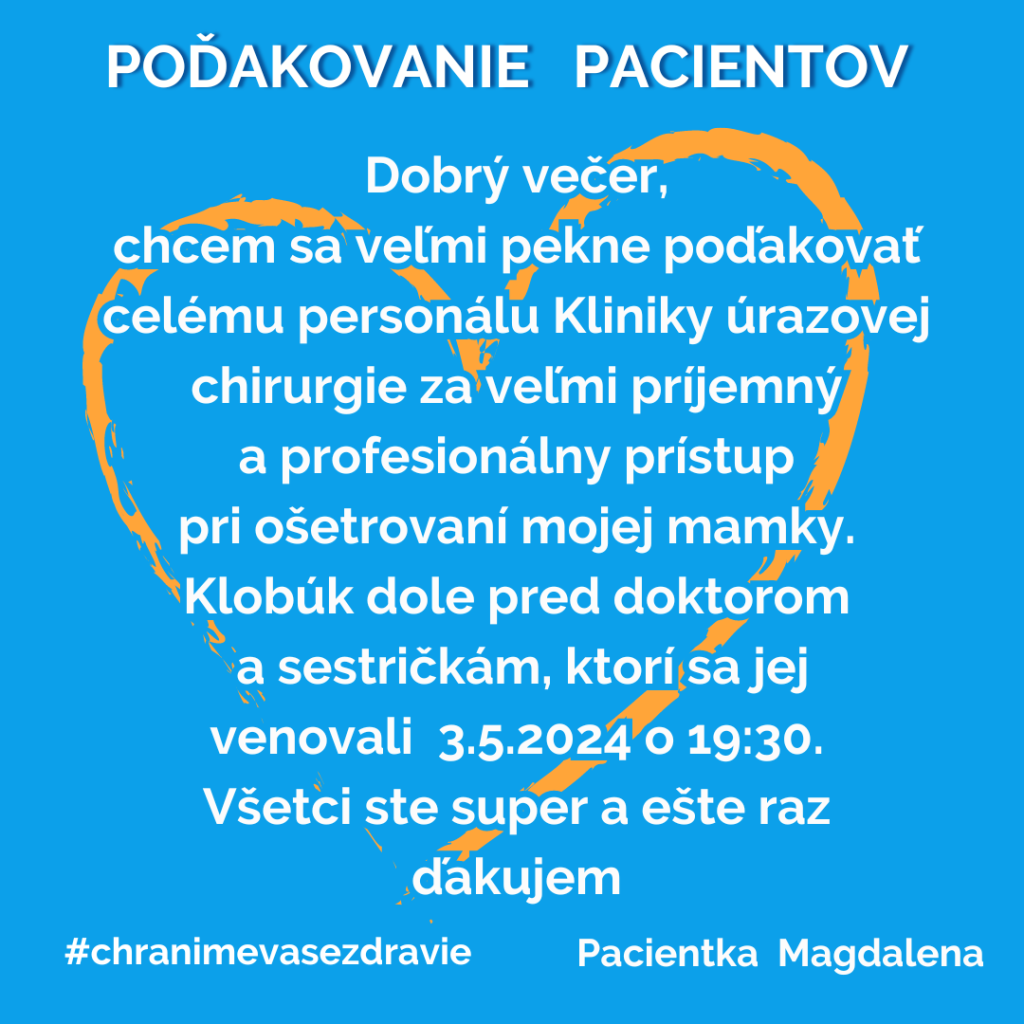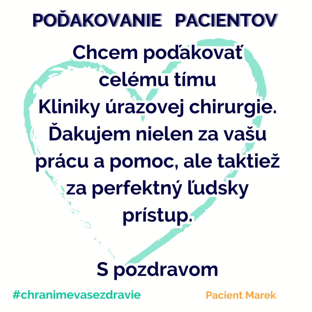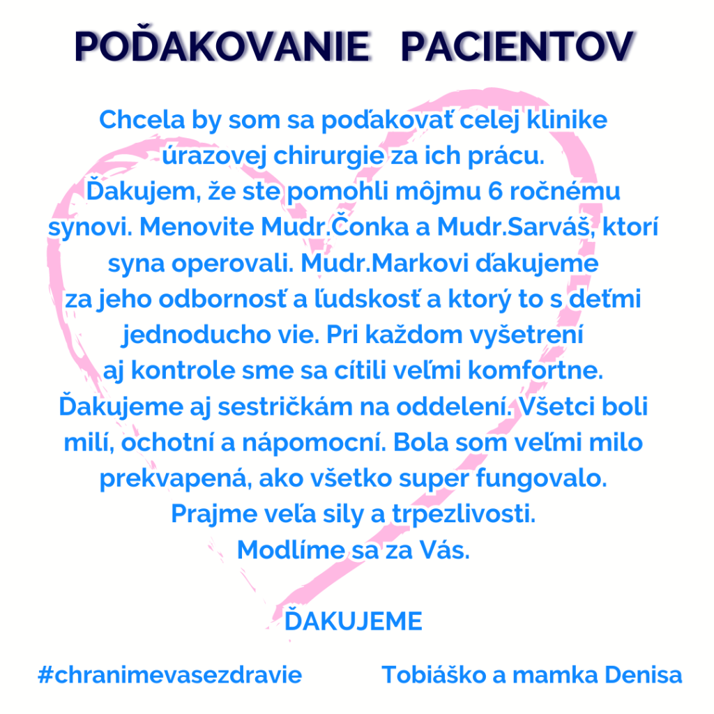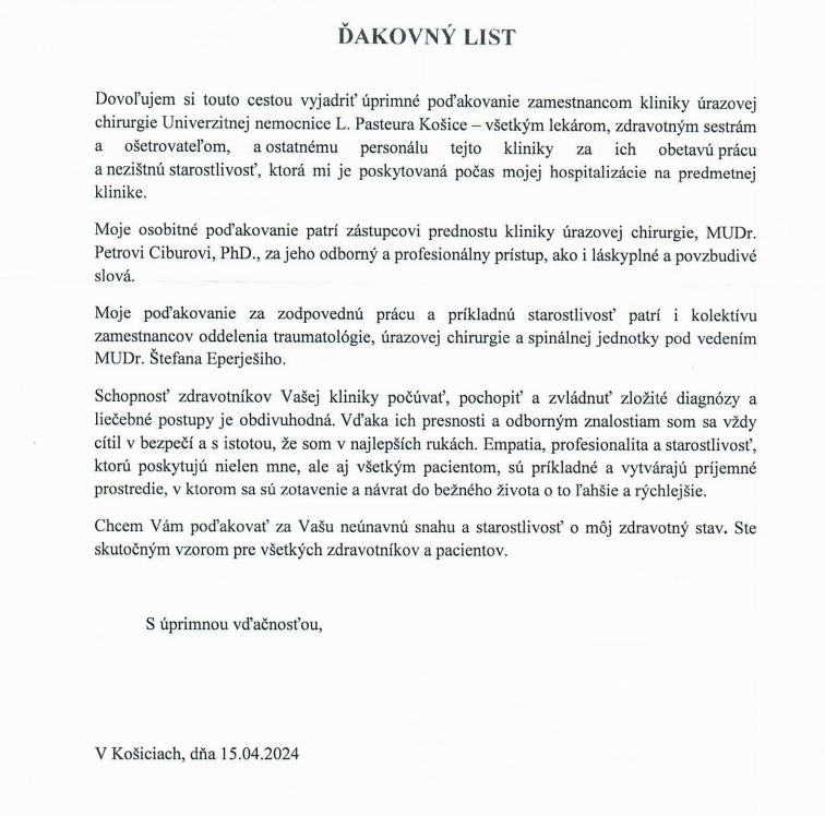 POĎAKOVANIE pre Kliniku úrazovej chirurgie, Rastislavova 43.