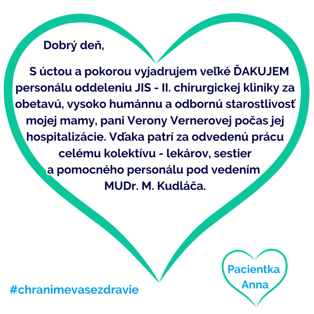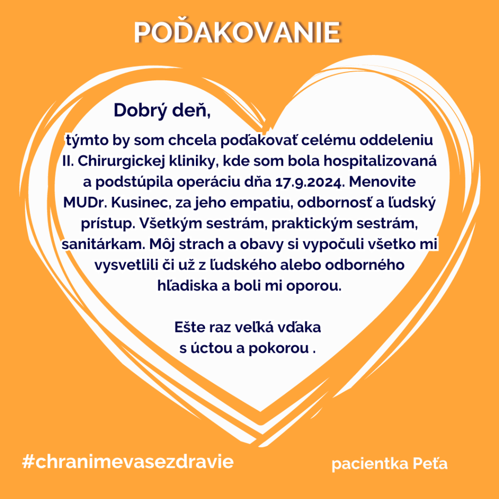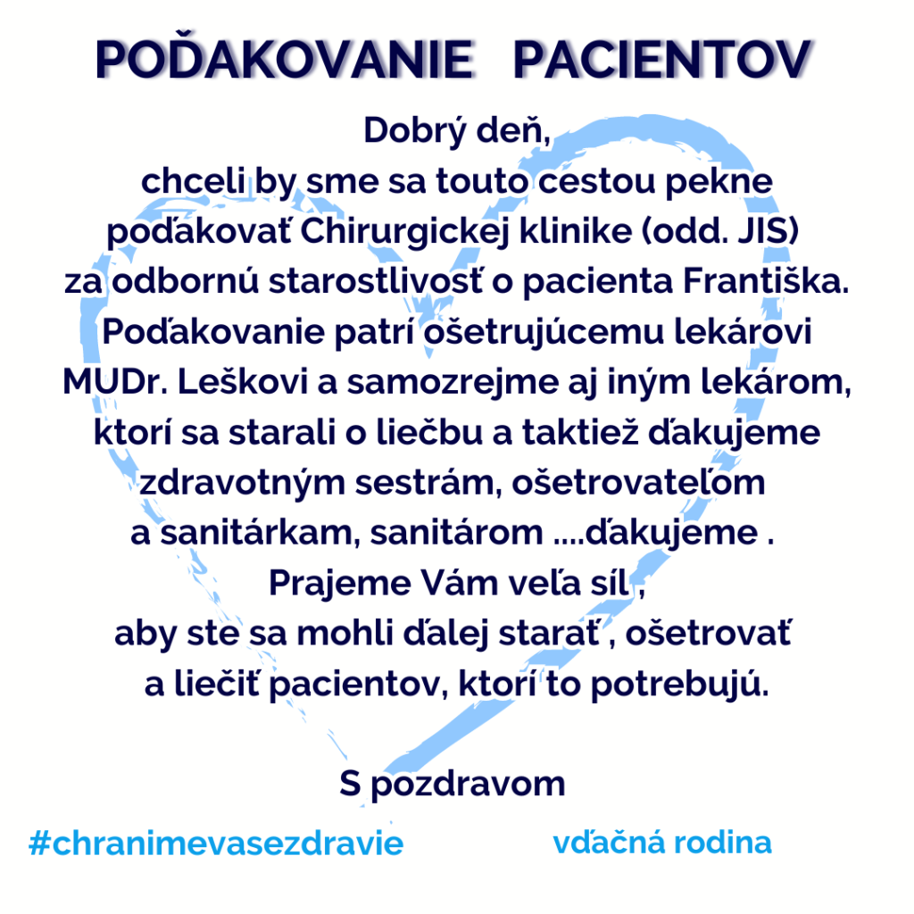 POĎAKOVANIE pre II. chirurgickú kliniku, Rastislavova 43.