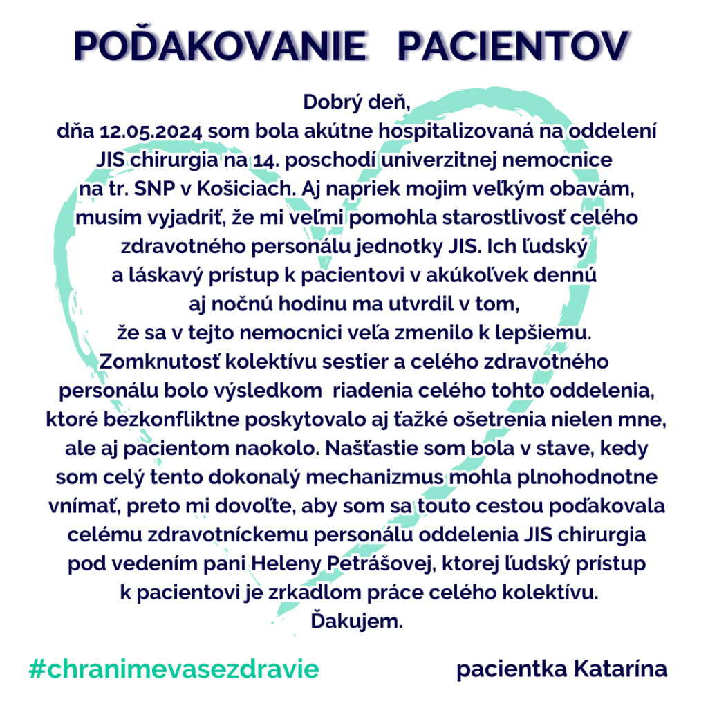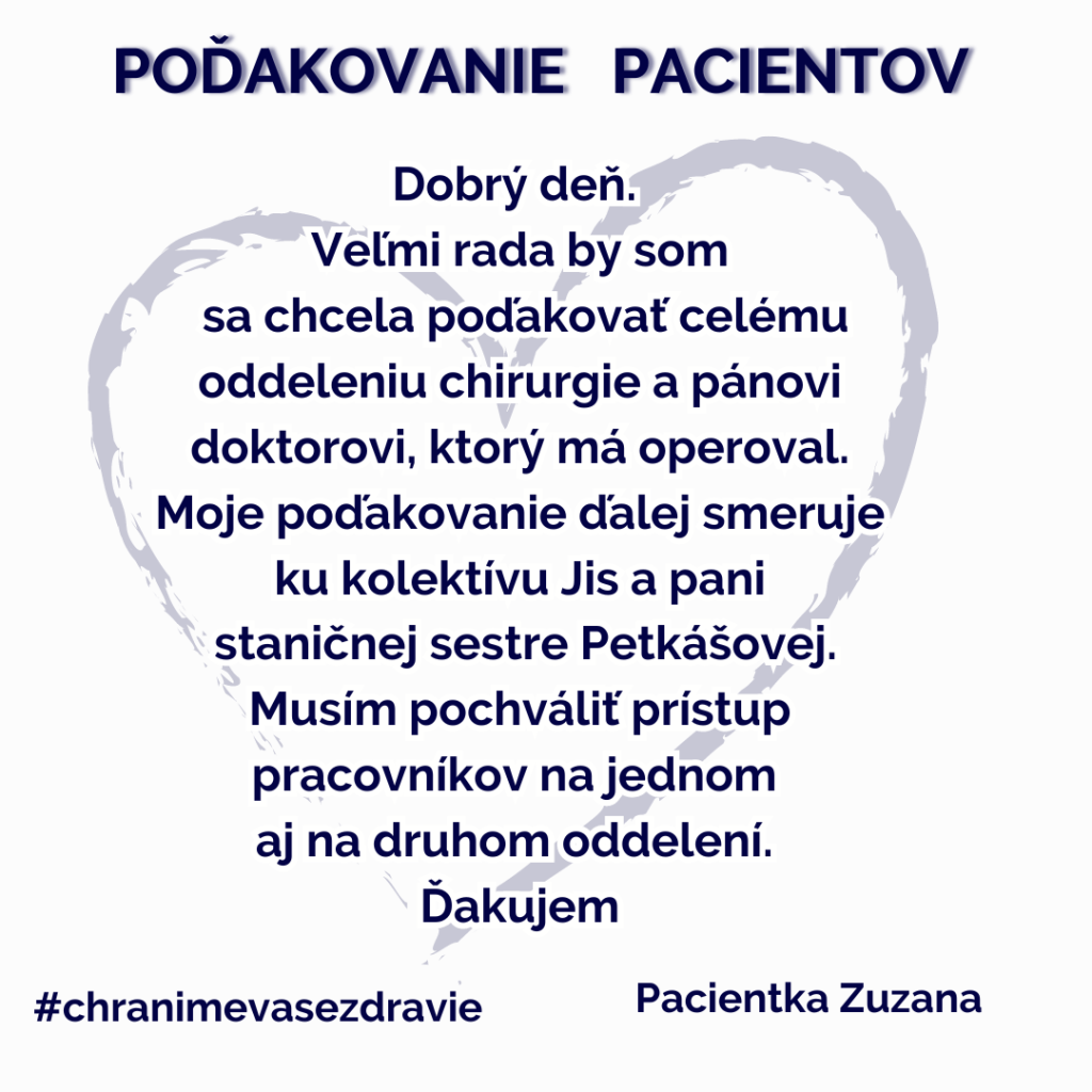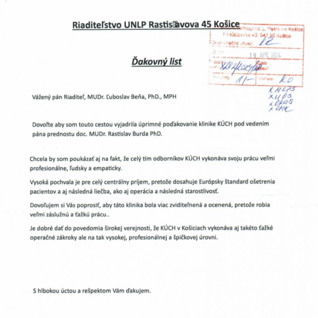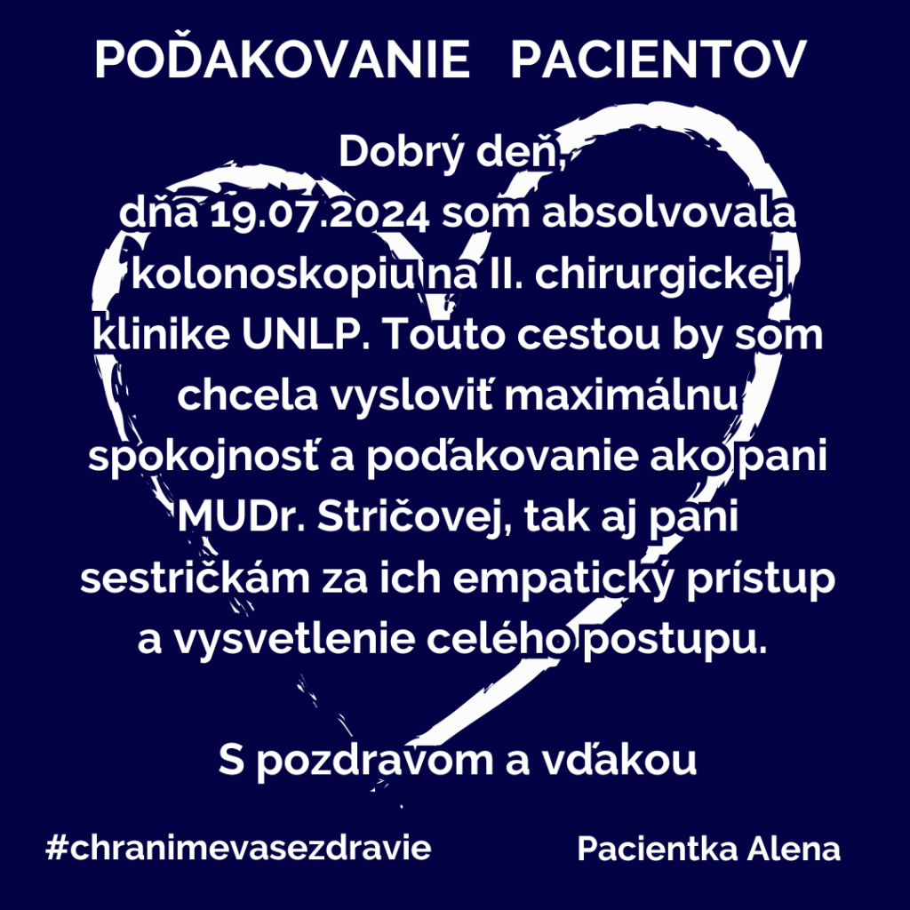 POĎAKOVANIE pre II. chirurgickú kliniku, Rastislavova 43.