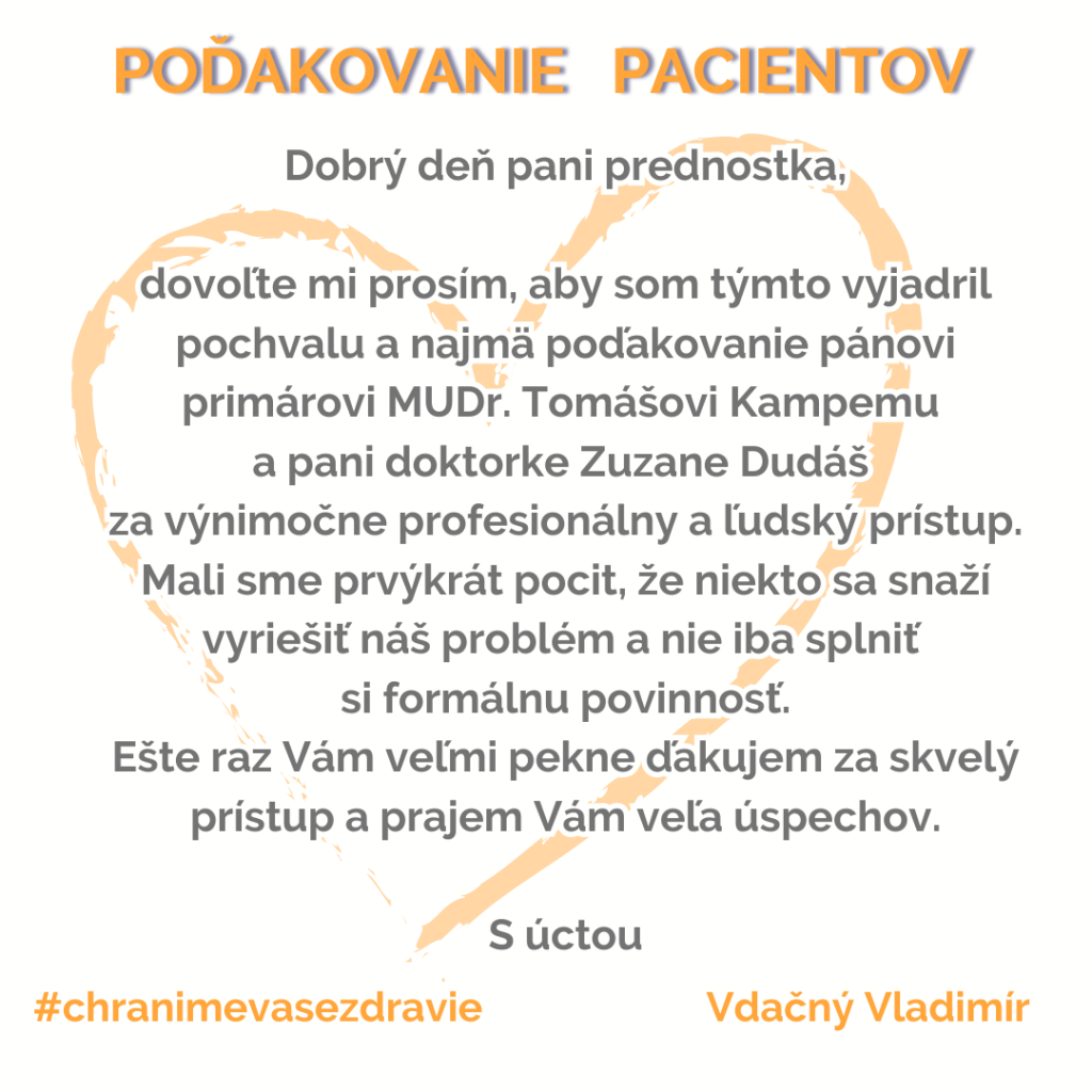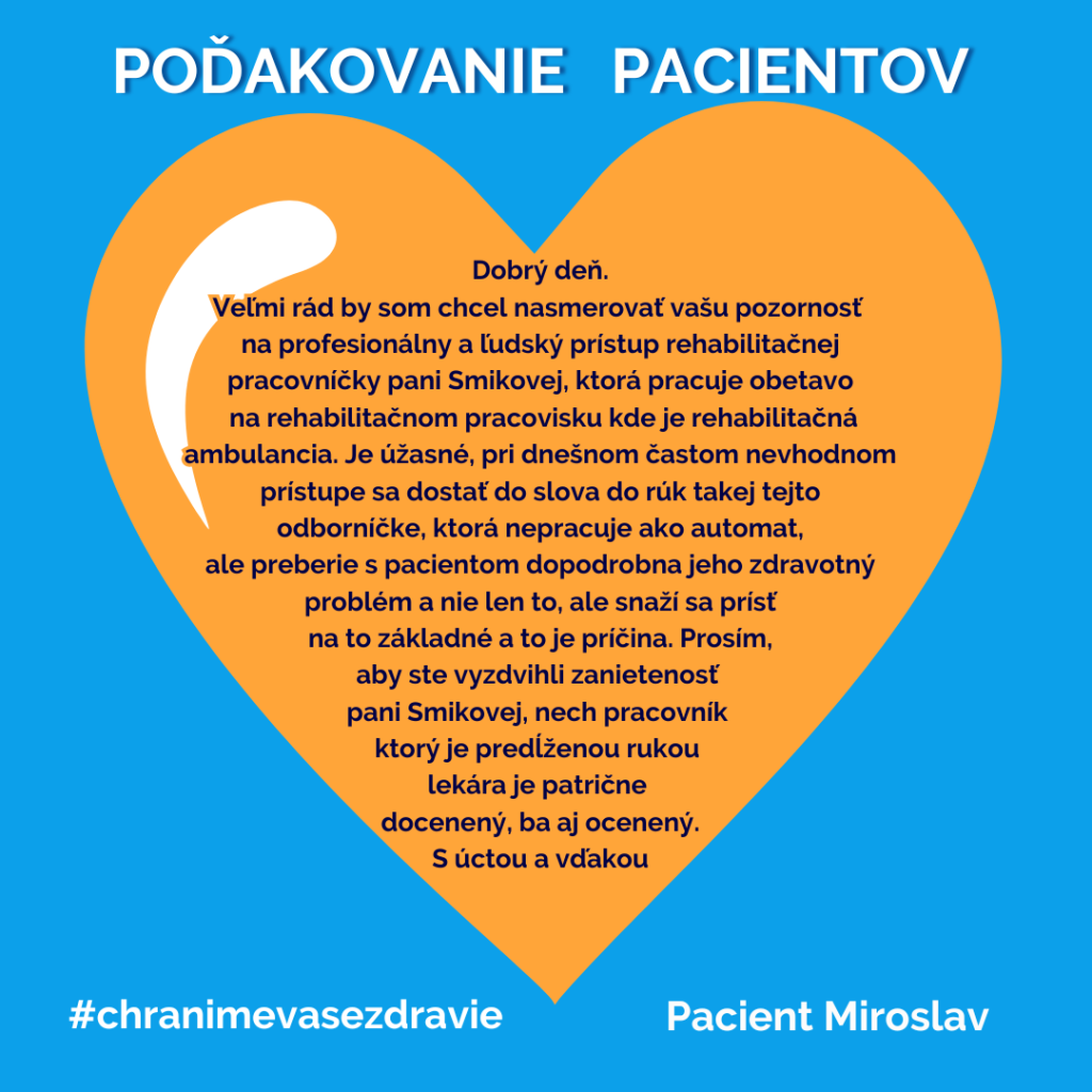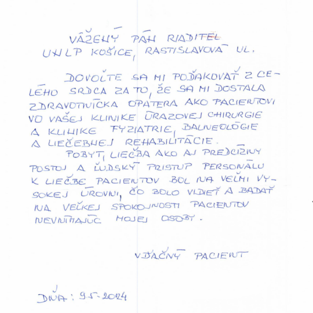 POĎAKOVANIE pre Kliniku úrazovej chirurgie a Klinike fyziatrie, balneológie a liečebnej rehabilitácie, Rastislavova 43.