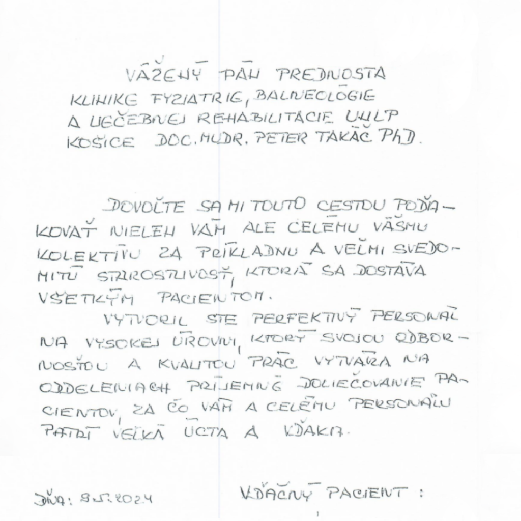 POĎAKOVANIE pre Klinike fyziatrie, balneológie a liečebnej rehabilitácie, Rastislavova 43.