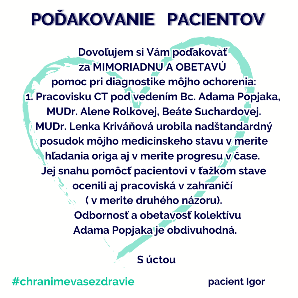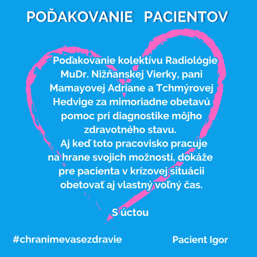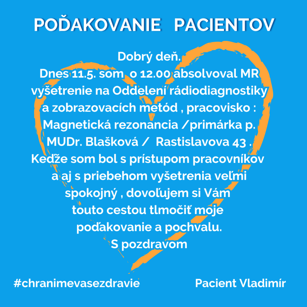 POĎAKOVANIE pre Oddelenie rádiodiagnostiky a zobrazovacích metód, Rastislavova 43
