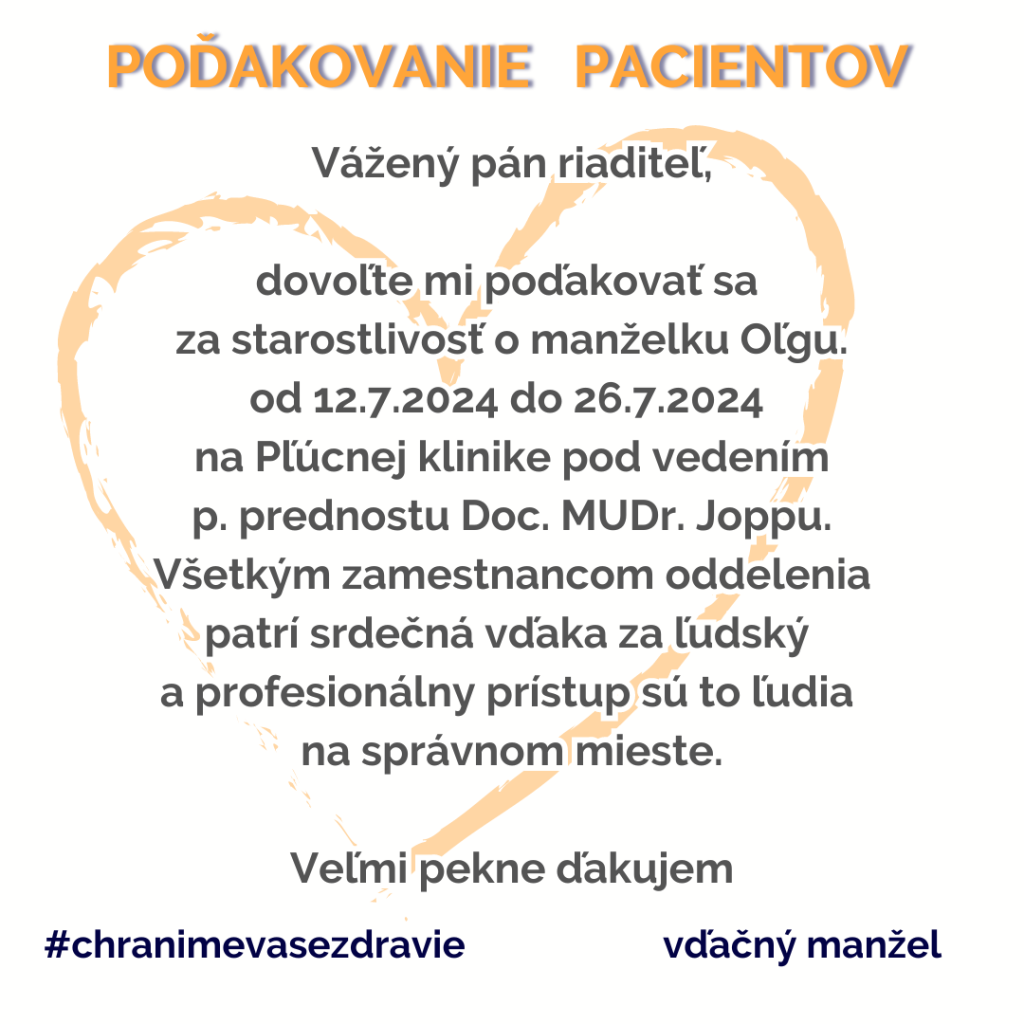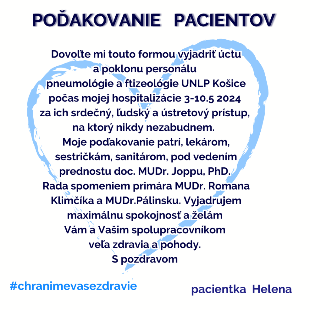 POĎAKOVANIE pre Kliniku pneumológie a ftizeológie, Rastislavova 43