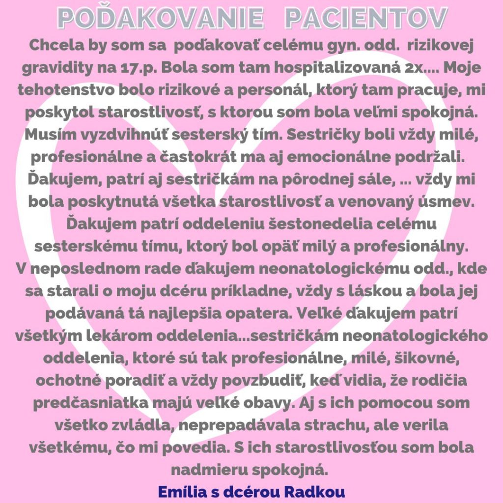 POĎAKOVANIE  pre  Gynekologicko-pôrodnícke oddelenie a Neonatologické oddelenie, Rastislavova 43.
