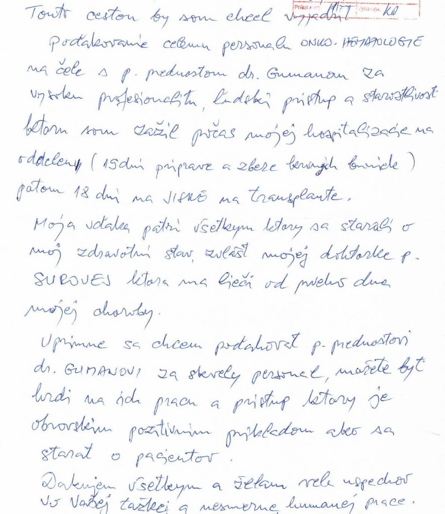 POĎAKOVANIE  pre Kliniku hematológie a onkohematológie, Tr. SNP 1.