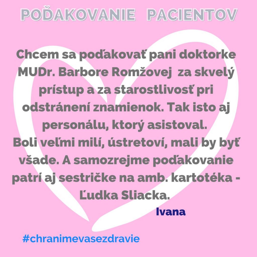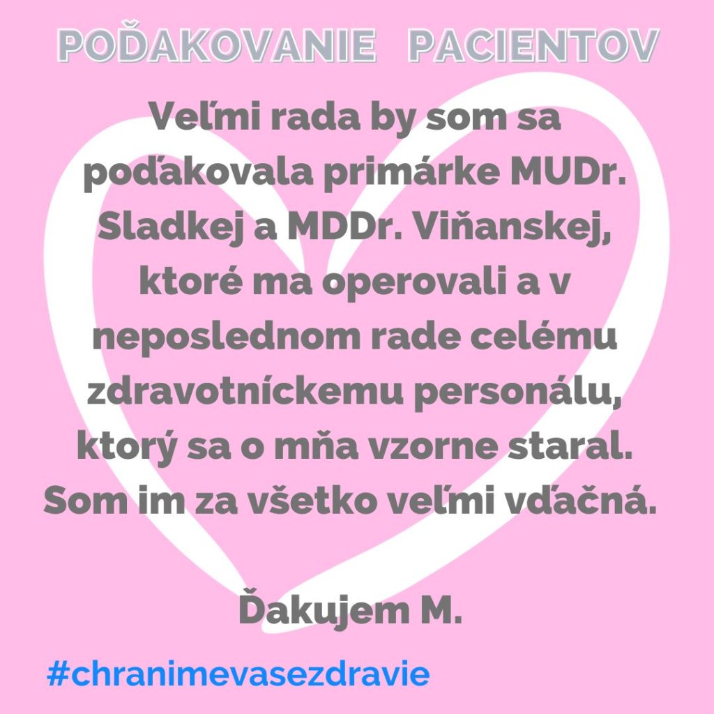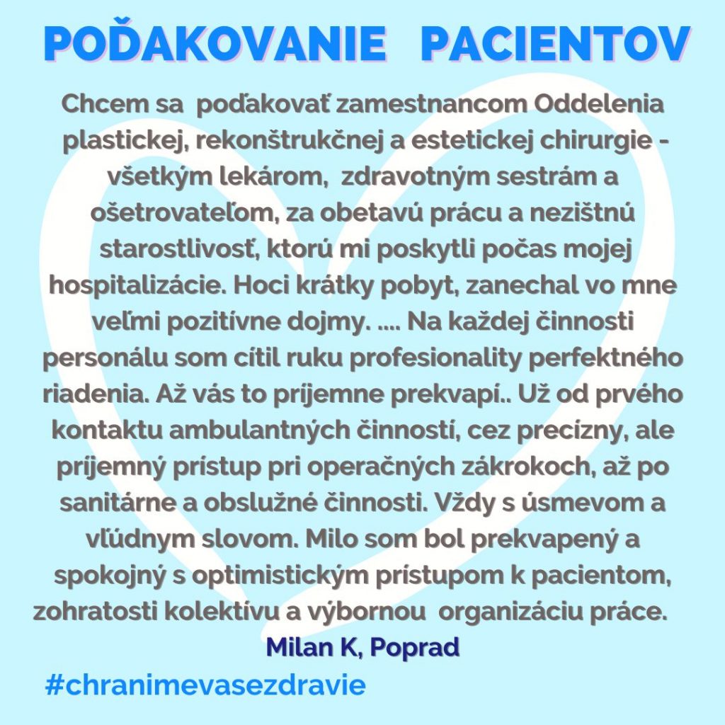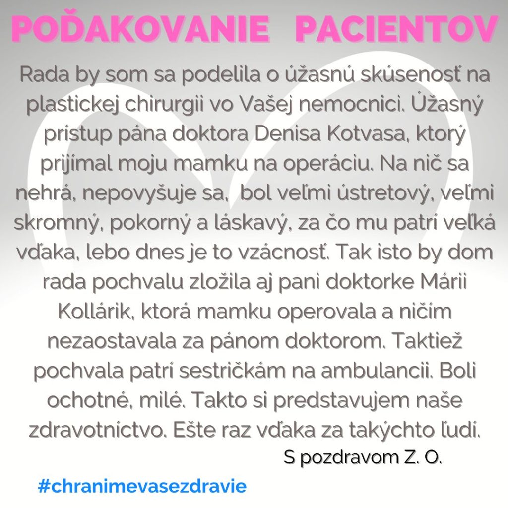 POĎAKOVANIE  pre Oddelenie plastickej, rekonštrukčnej a estetickej chirurgie, Rastislavova 43.