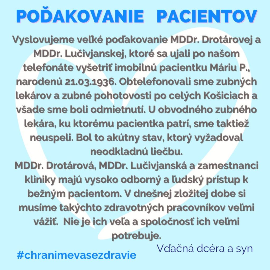 POĎAKOVANIE  pre Kliniku stomatológie a maxilofaciálnej chirurgie, Rastislavova 43.