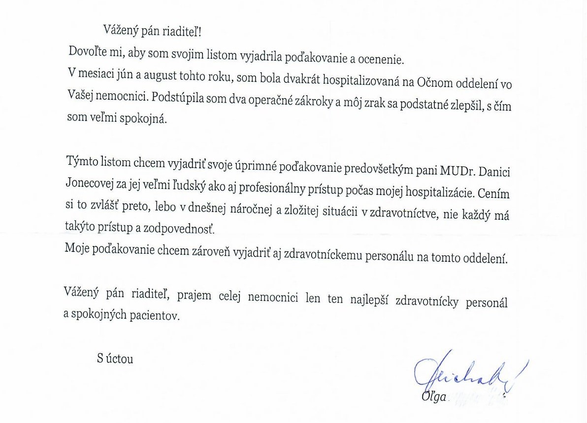 POĎAKOVANIE  pre Očnú kliniku, Tr. SNP 1.